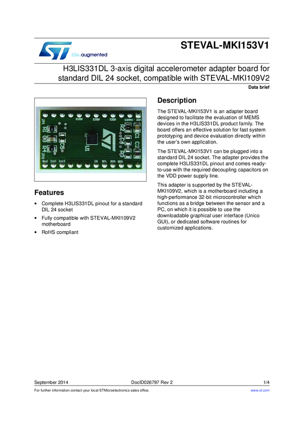 H3LIS331DL 3-axis digital accelerometer adapter board for standard DIL 24 socket, compatible with STEVAL-MKI109V2