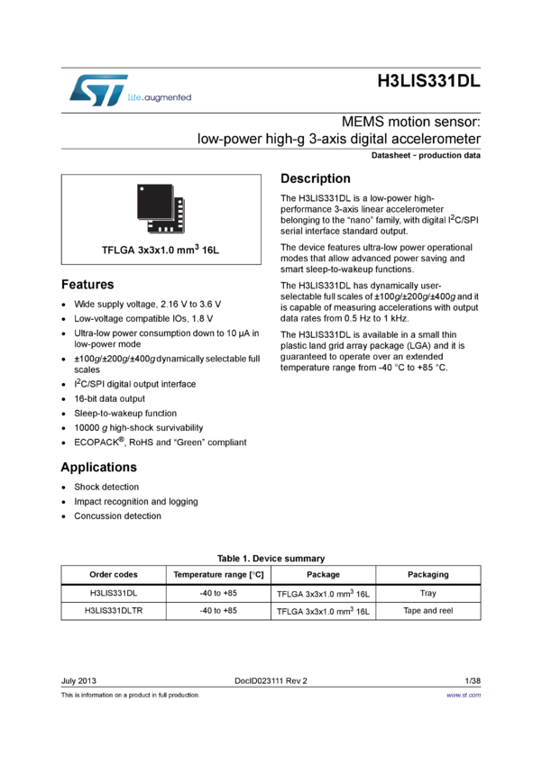 MEMS motion sensor: low power high g 3-axis digital accelerometer