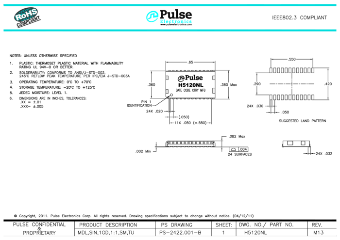 Telecom Transformer 1:1 1500Vrms 1dB Surface Mount