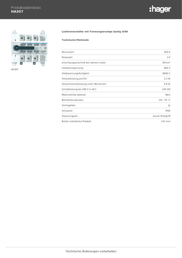 Przełącznik rozłączający Hager HA307, 3 styki, 415 V, 160 A