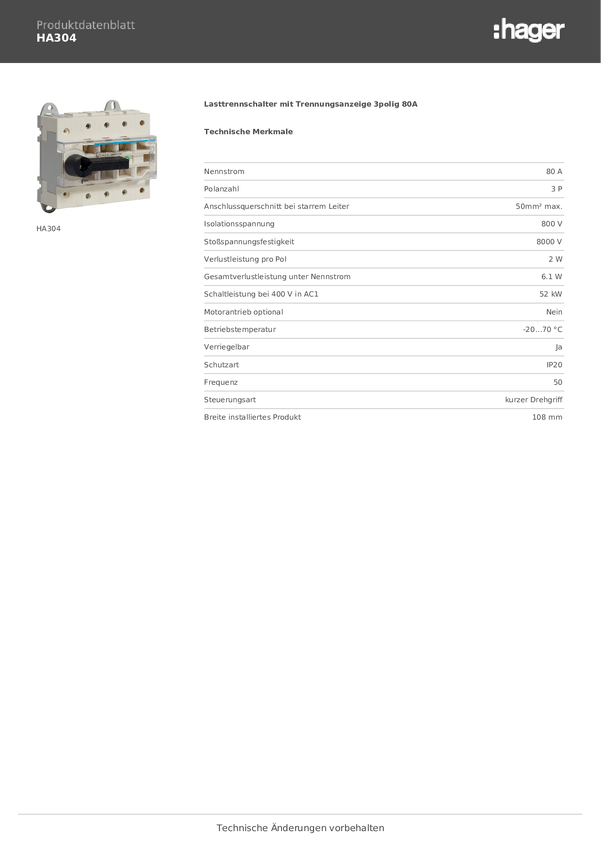 Hager HA304 Przełącznik rozłączający 3 styki 80 A 415 V