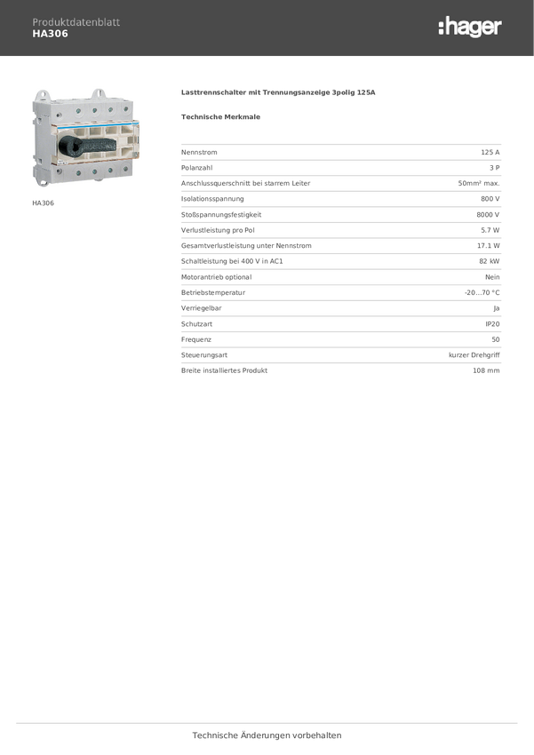 Przełącznik rozłączający Hager HA306, 3 styki, 415 V, 125 A