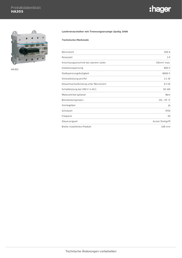 Hager HA305 Przełącznik rozłączający 3 styki 100 A 415 V