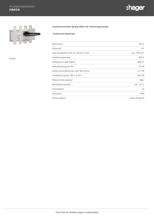Przełącznik rozłączający Hager HA454, 4 styki, 415 V, 250 A