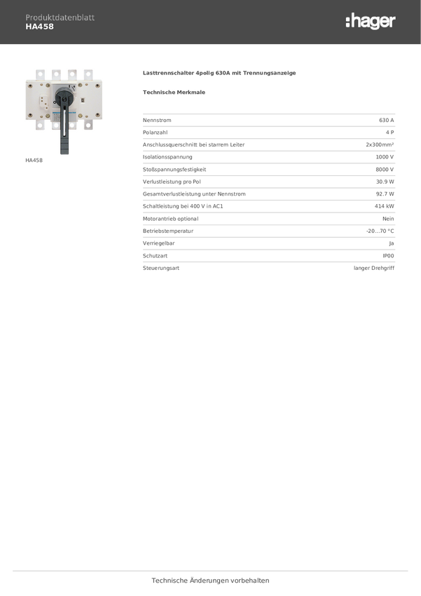 Hager HA458 Przełącznik rozłączający 4 styki 630 A 415 V