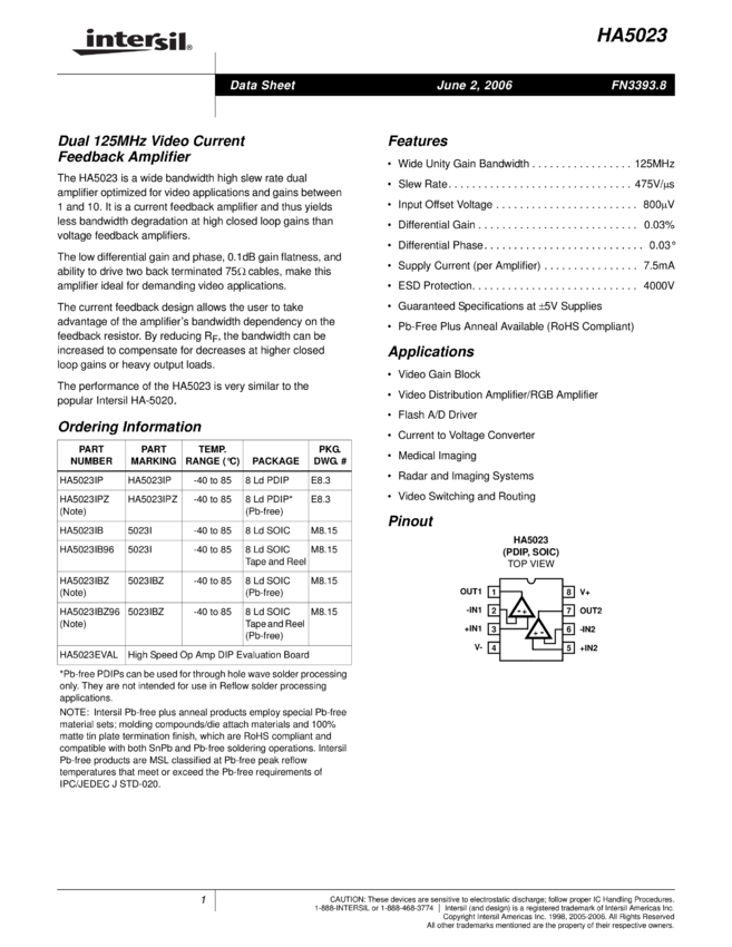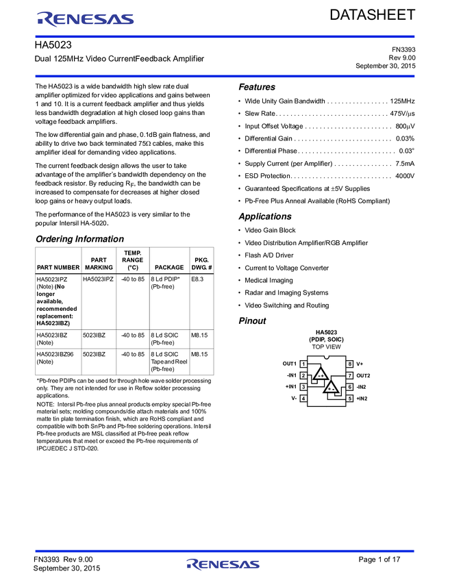 Dual, 125MHz, Video Current Feedback Amplifier with Disable