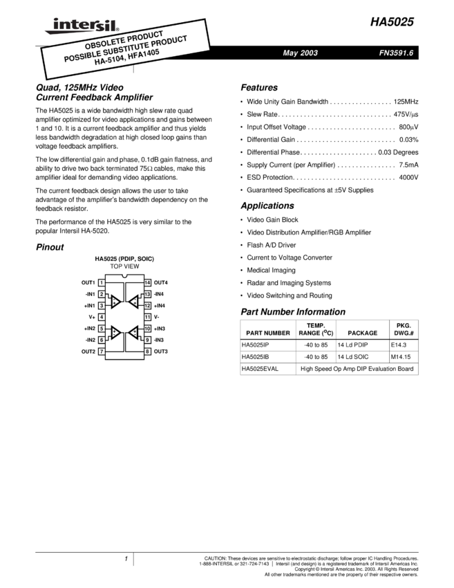 Quad 125MHz Video Current Feedback Amplifier with Disable