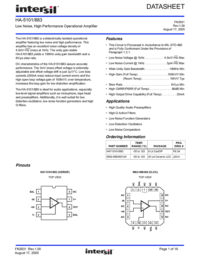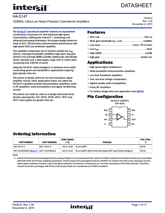 Dual and Quad, 8MHz and 60MHz, Low Noise Operational Amplifiers