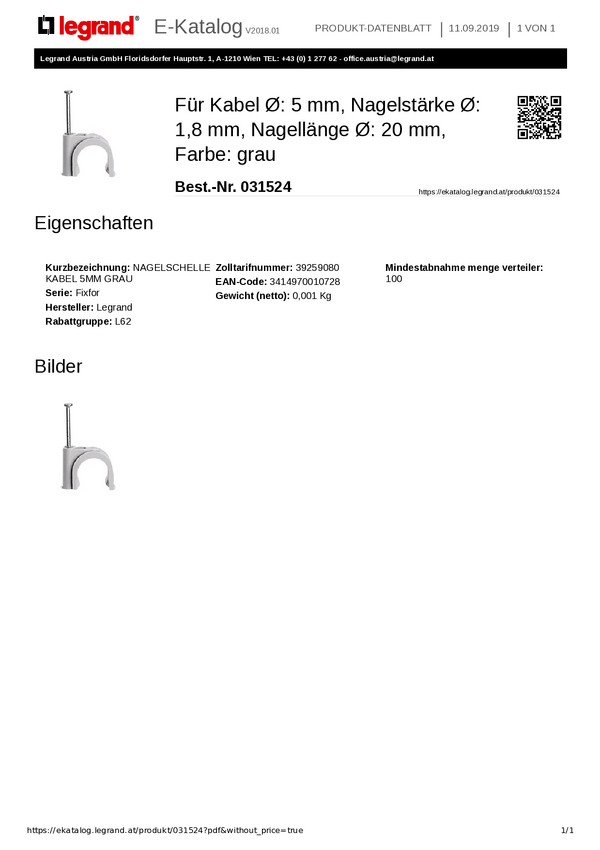 Legrand Legrand 031526 Haczyki z tworzywa sztucznego 031526 Zakres średnicy wiązki 7 mm (max) szary 1000 szt.