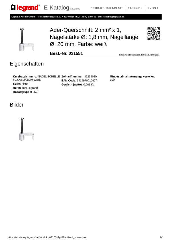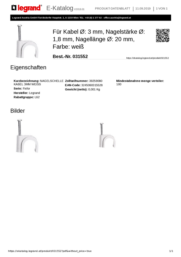 Legrand Legrand 031552 Haczyki z tworzywa sztucznego 031552 Zakres średnicy wiązki 3 mm (max) czysty biały 2000 szt.