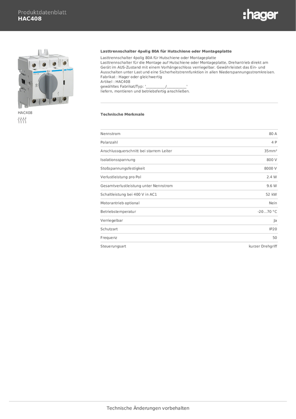 Hager HAC408 Przełącznik rozłączający 4 styki 80 A 415 V