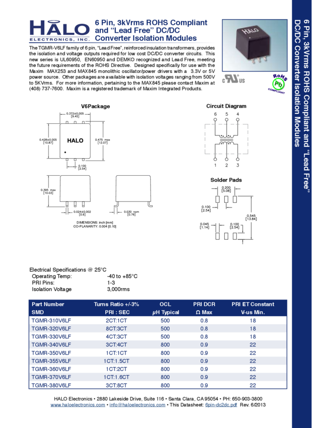 Power Transformer 1500Vrms 1:1:0.25:0.2:0.2:0.25 Triple Prim. Triple Sec. 5V Sec. Surface Mount