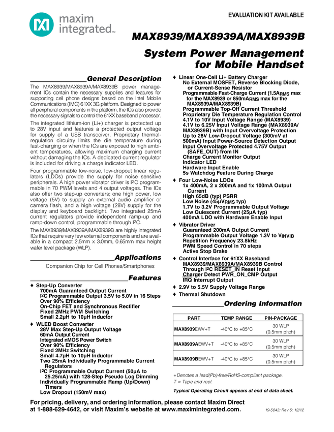 MAX8939, MAX8939A, MAX8939B System Power Management for Mobile Handsets