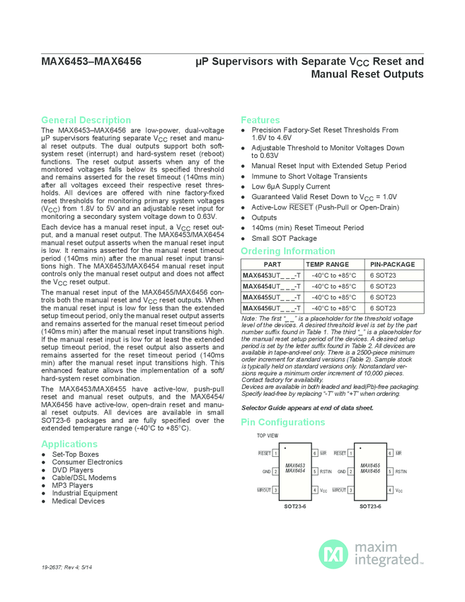 MAX6456 &#181P Supervisors with Separate Vcc Reset and Manual Reset Outputs for Software/Hardware Resets