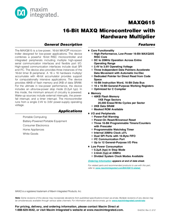 MAXQ615 16-Bit RISC Microcontroller with Hardware Multiplier