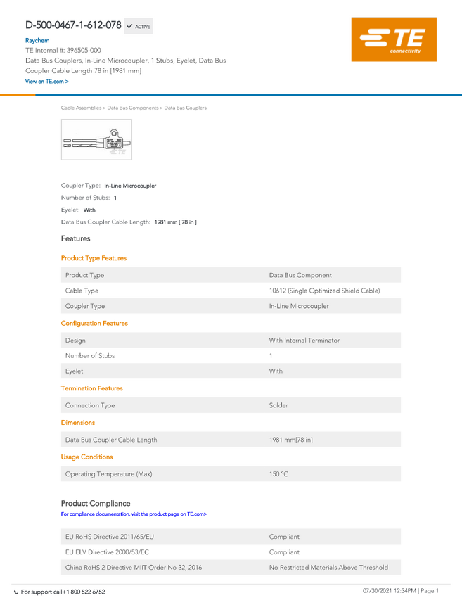 TE Connectivity TE RAY Data Bus Harnesses 396505-000, 1x -02050007010906