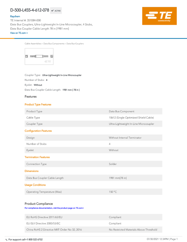 TE Connectivity TE RAY Data Bus Harnesses 351084-000, 1x -02050007010357