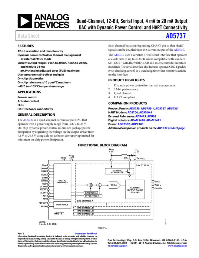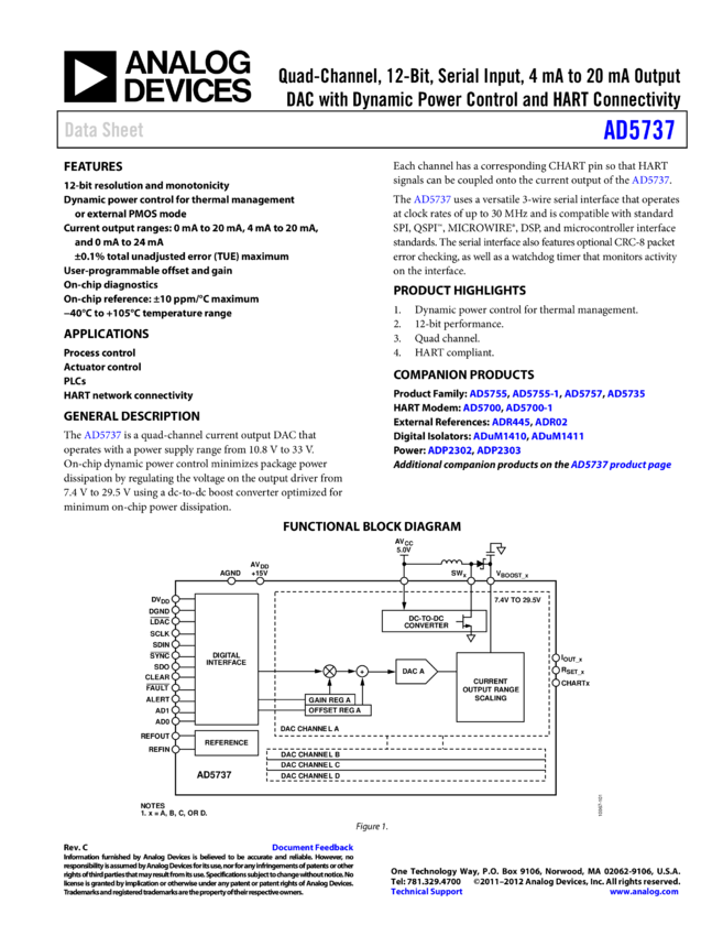 AD5737: Quad Channel, 12-Bit, Serial Input, 4-20mA Output DAC with Dynamic Power Control and HART Connectivity