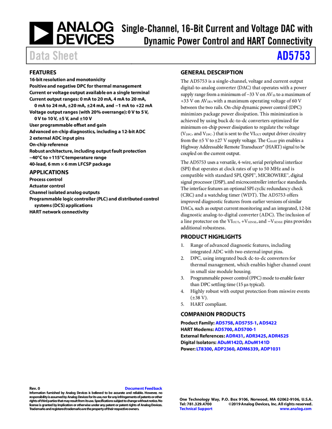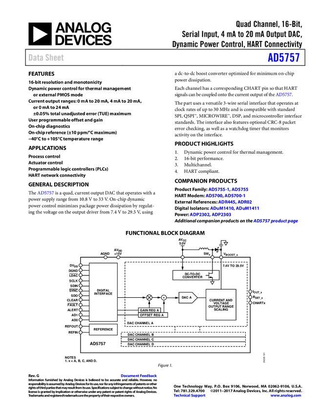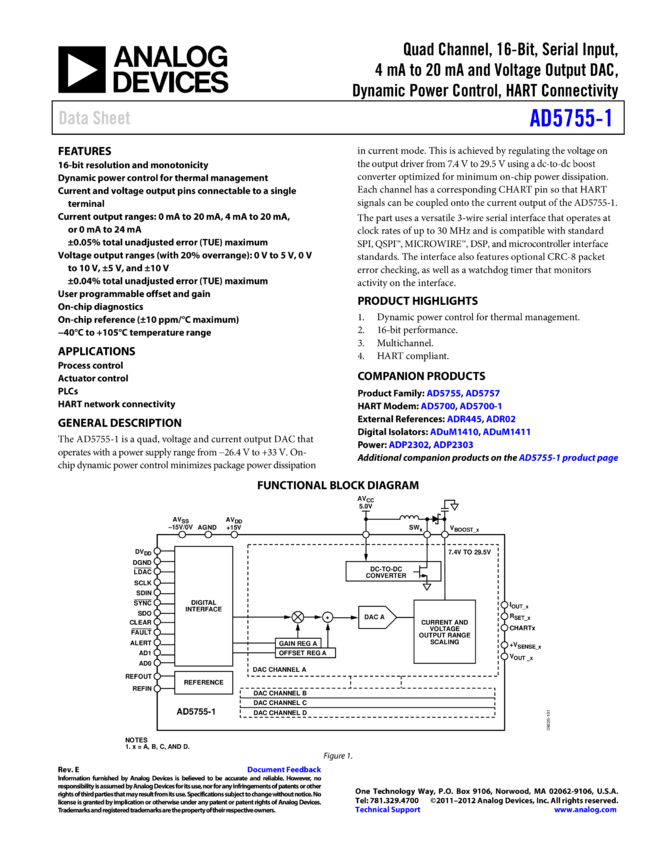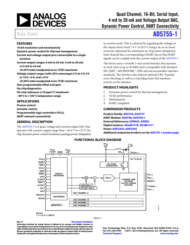 AD5755-1: Quad Channel, 16-Bit, Serial Input, 4-20mA & Voltage Output DAC, Dynamic Power Control, HART Connectivity
