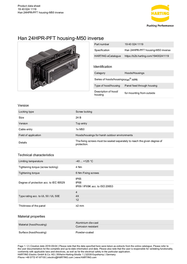 Obudowa przepustu ściennego 19 40 024 1119 Harting 1 szt.