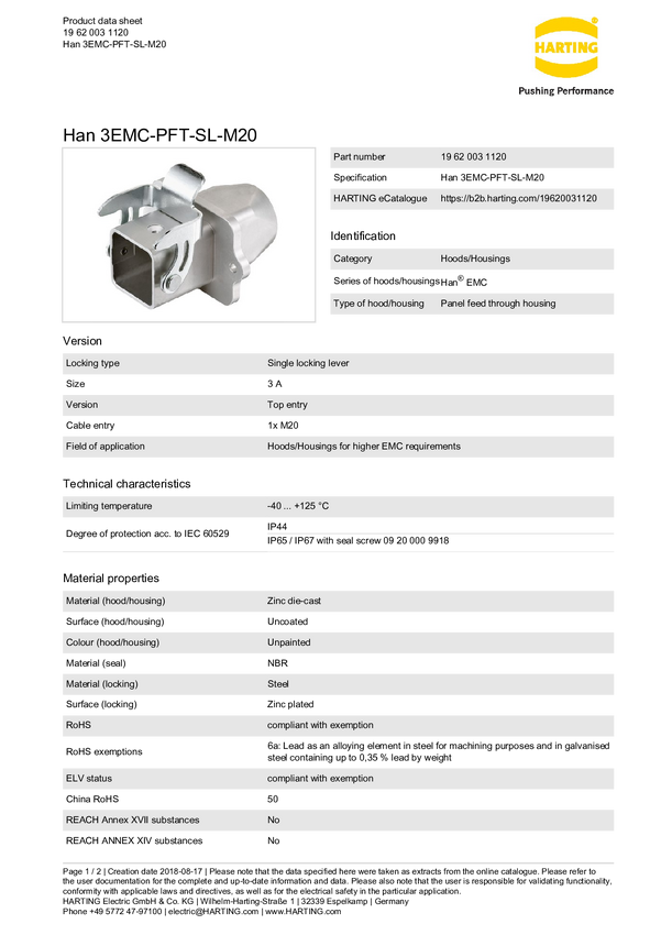 Obudowa przepustu ściennego Harting 19 62 003 1120, odlew cynkowy, 1 szt.