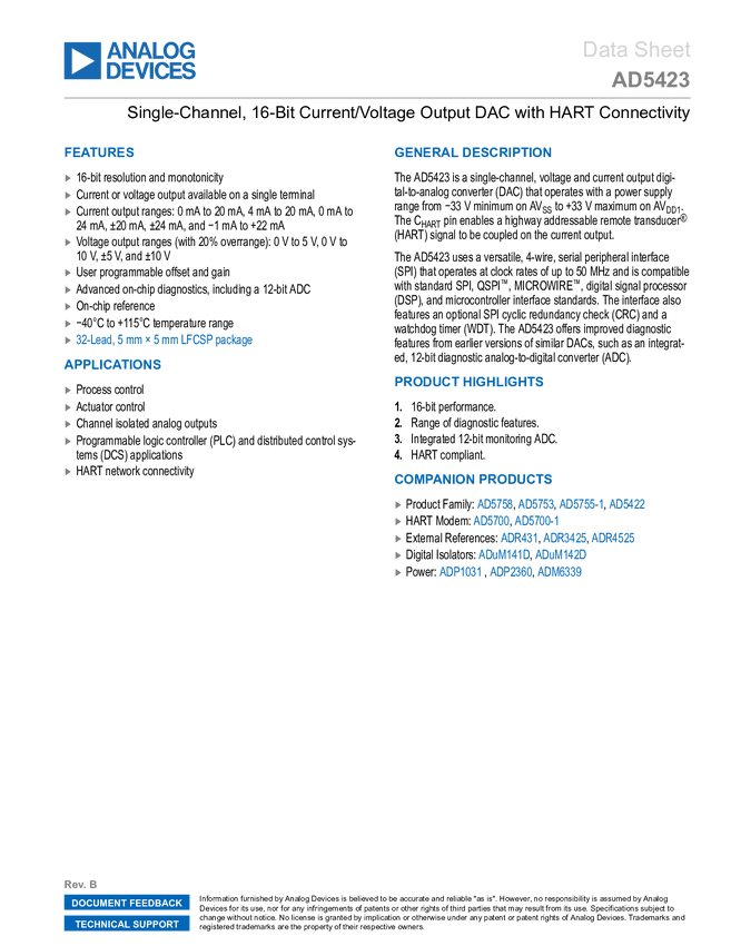 AD5422: Single Channel, 16-Bit, Current Source & Voltage Output DAC, HART Connectivity