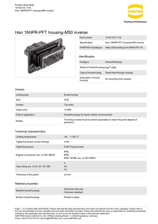Obudowa przepustu ściennego Harting 19 40 016 1119, odlew aluminium, 1 szt.