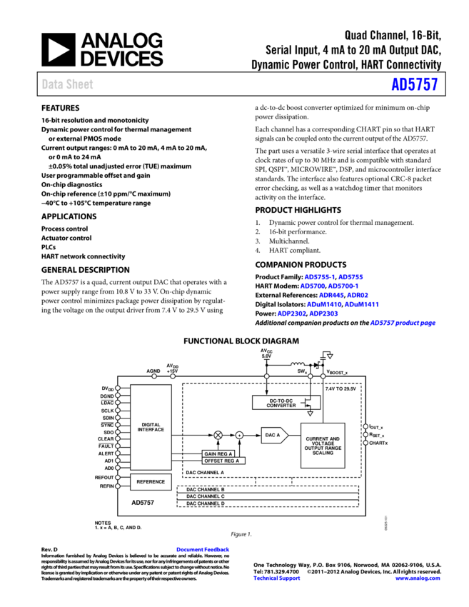 AD5757: Quad Channel, 16-Bit, Serial Input, 4-20mA Output DAC, Dynamic Power Control, HART Connectivity