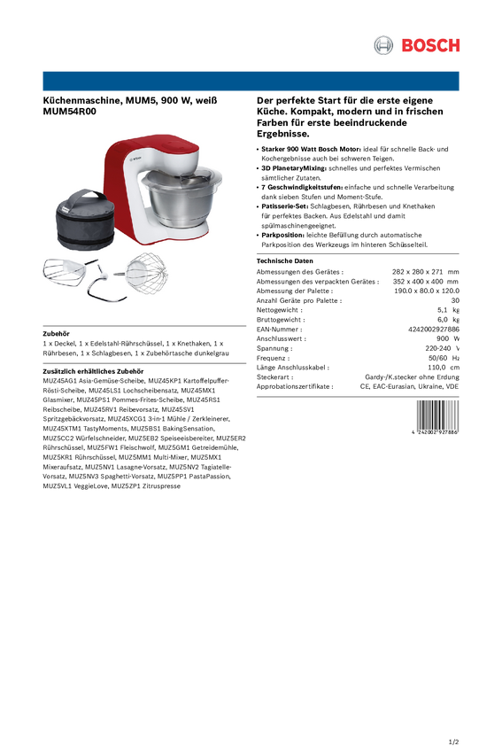 Bosch Haushalt MUM54R00 Robot kuchenny 900 W biały, czerwony