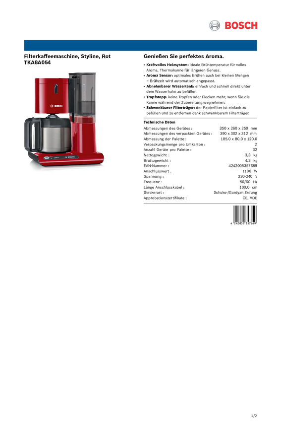 Ekspres do kawy Bosch Haushalt TKA8A054 Thermo Styline 1100 W