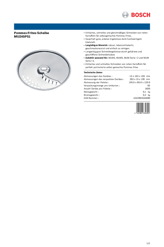 Krajalnica do frytek Bosch Haushalt MUZ45PS1, stali szlachetnej
