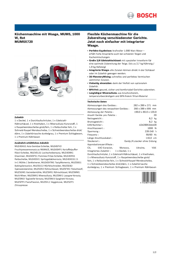 Robot kuchenny Bosch Haushalt MUM5/Serie 4, 1000 W, czerwono-srebrny