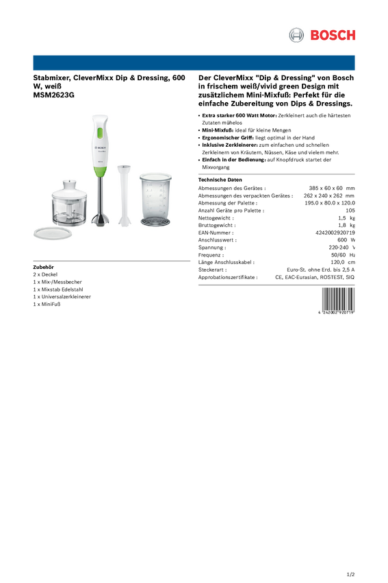Blender ręczny Bosch Haushalt MSM2623G, 600 W