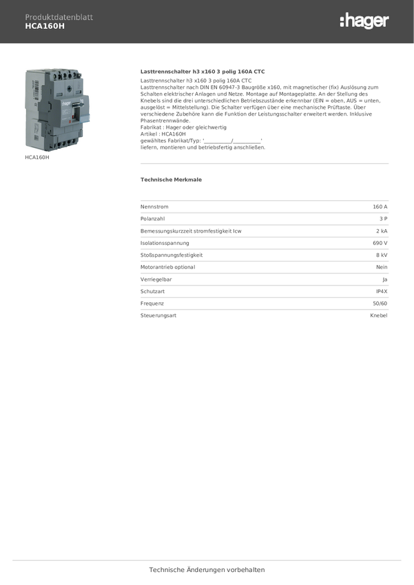 Przełącznik rozłączający Hager HCA160H, 3 styki, 690 V, 160 A