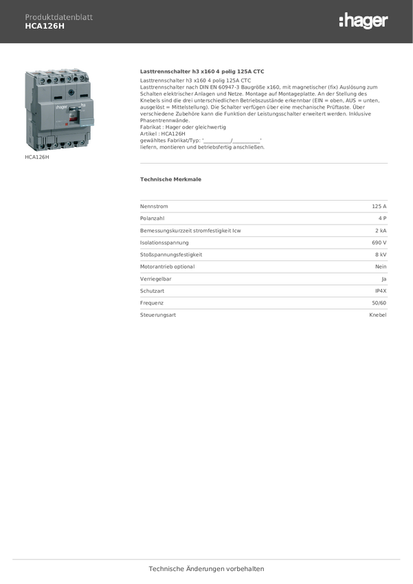 Przełącznik rozłączający Hager HCA126H, 4 styki, 690 V, 125 A