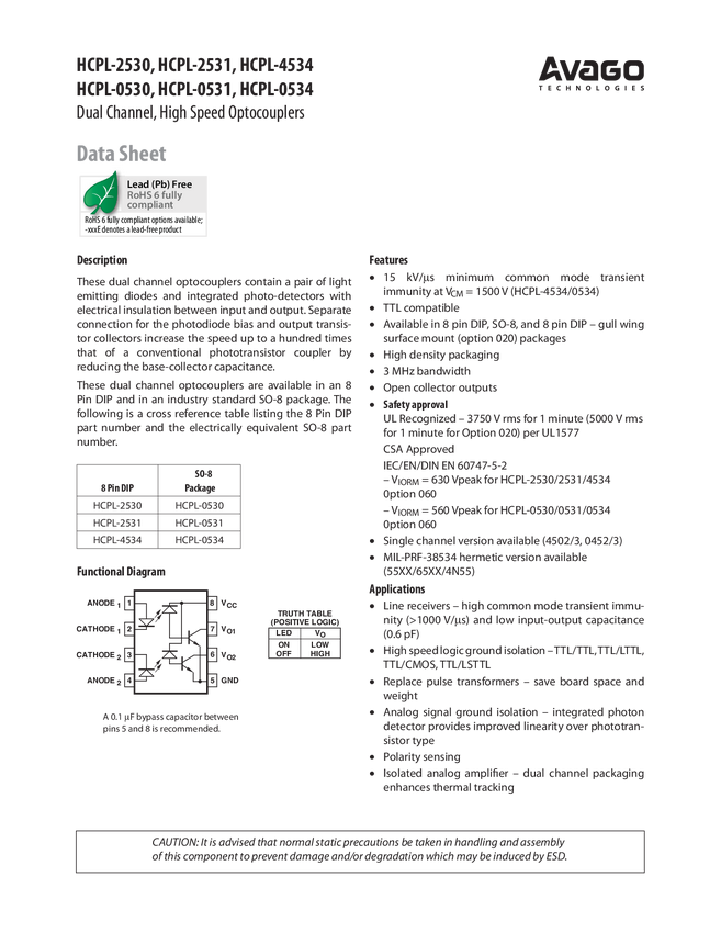 8-Pin DIP 1Mbit/s Dual-Channel High Speed Transistor Output Optocoupler <sub>(Not recommend for new design. The new equivalent part number is HCPL253xM)