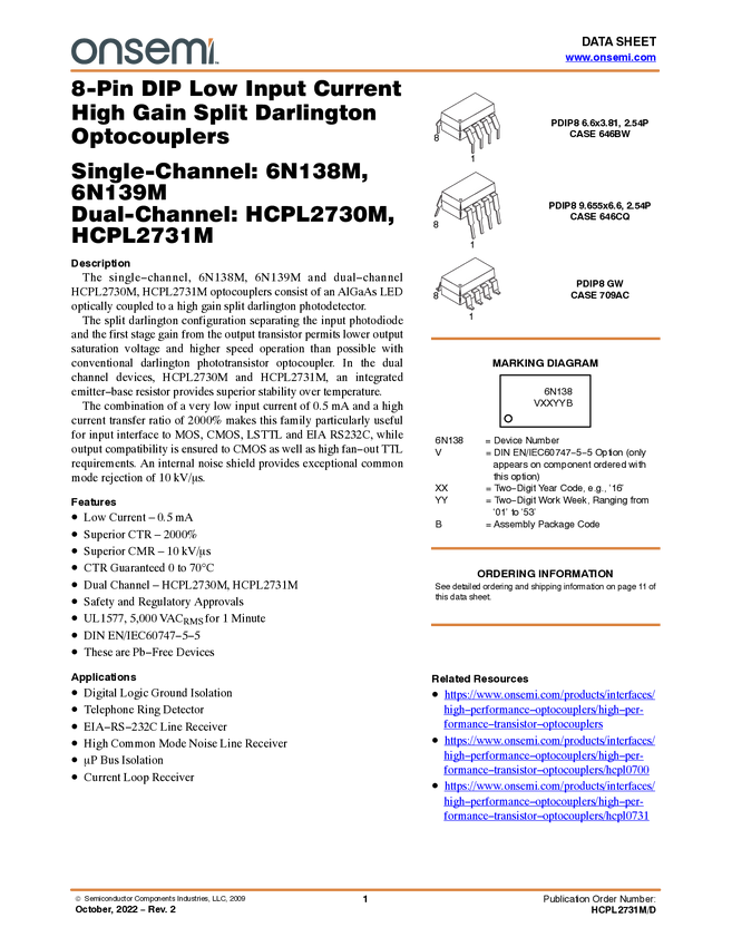8-Pin DIP Dual-Channel Low Input Current High Gain Split Darlington Output Optocoupler <sub>(Not recommend for new design. The new equivalent part number is HCPL273xM)