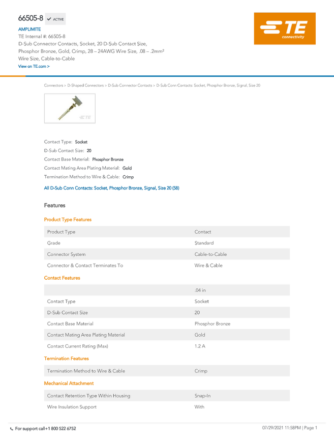 TE Connectivity 66505-8 TE AMP AMPLIMITE HD20 Crimp Snap-In, 1 szt.