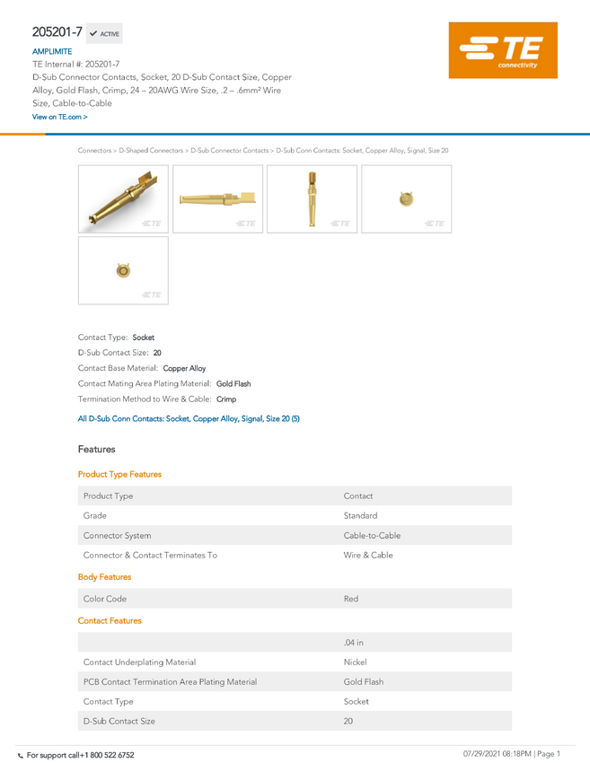 TE Connectivity 205201-7 TE AMP AMPLIMITE HD20 Crimp Snap-In, 1 szt.