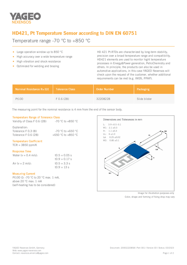 Yageo Nexensos 32208228 Platynowy czujnik temperatury HD421, PT100, -70 do +850 °C