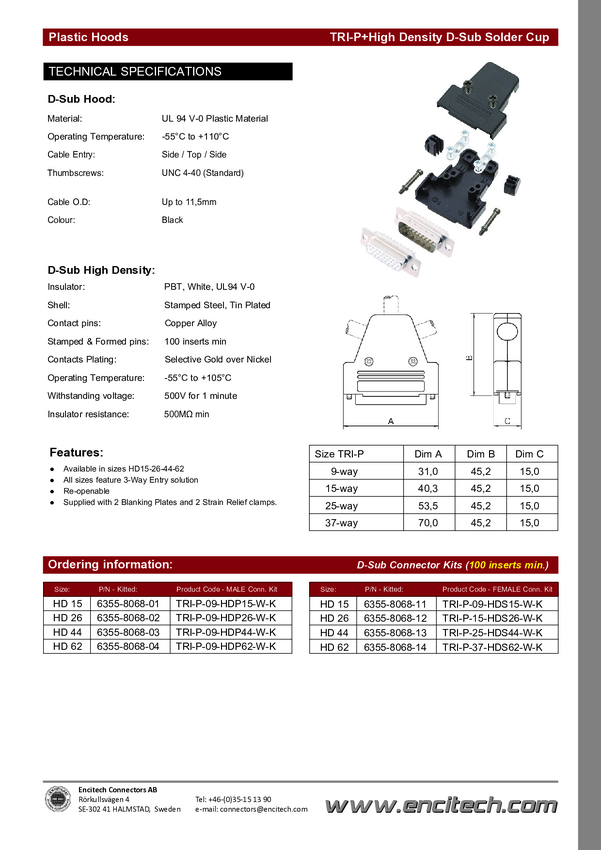 encitech TRI-P-09-HDP15-W-K 6355-8068-01 Zestaw listew męskich D-Sub 180 ° Ilość styków: 15 kielich lutowniczy 1 szt.