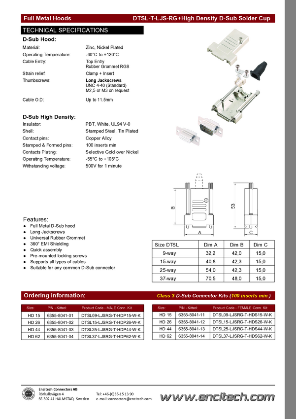 encitech DTSL37-LJSRG-T-HDP62-W-K 6355-8041-04 Zestaw listew męskich D-Sub 180 ° Ilość styków: 62 kielich lutowniczy 1 s