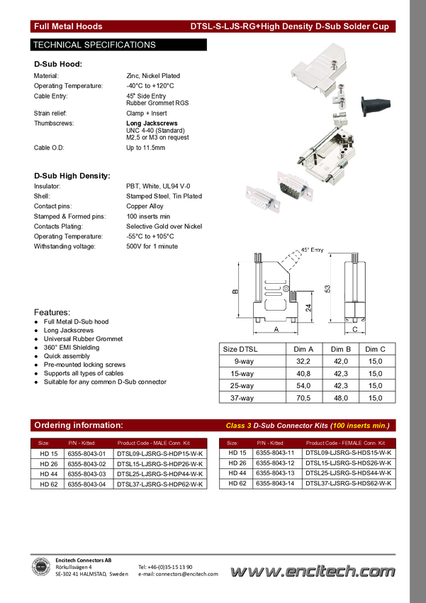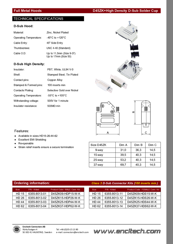 encitech 6355-8043-01 Zestaw listew męskich D-Sub DTSL09-LJSRG-S-HDP15-W-K, rzędy: 3, styki: 15, 45 °, 1 szt.