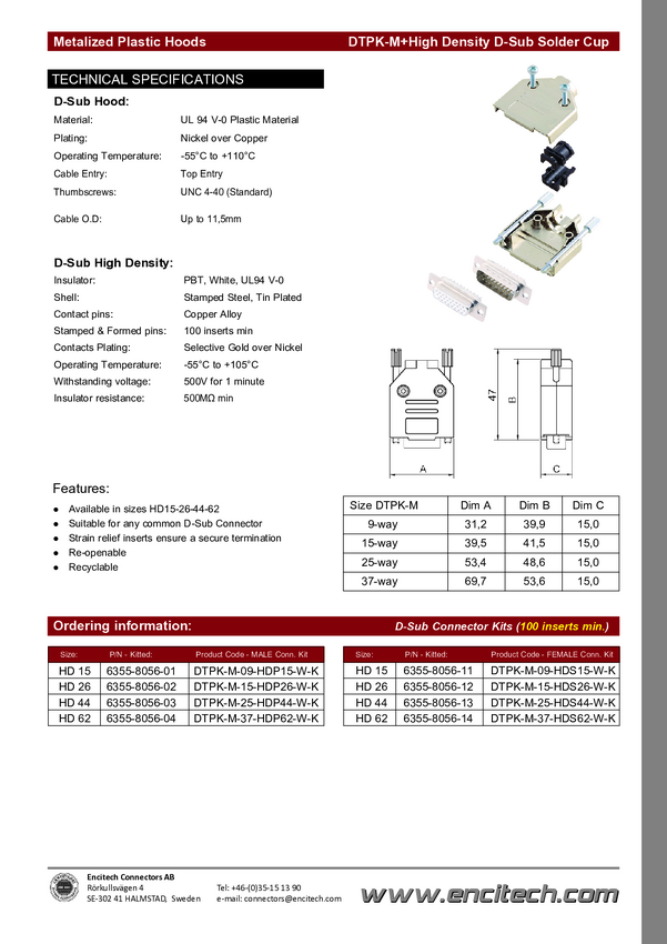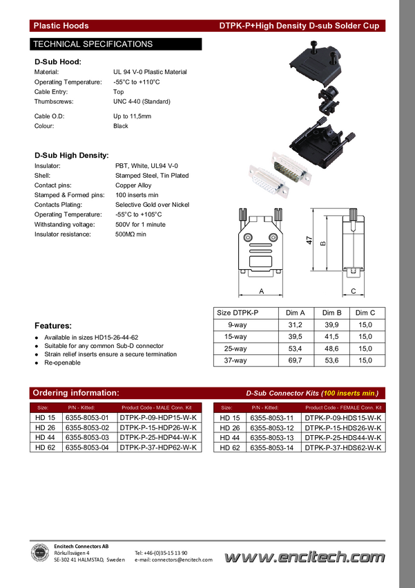 encitech 6355-8063-03 Zestaw listew męskich D-Sub DTZF25-HDP44-W-K, rzędy: 3, styki: 44, 180 °, 1 szt.