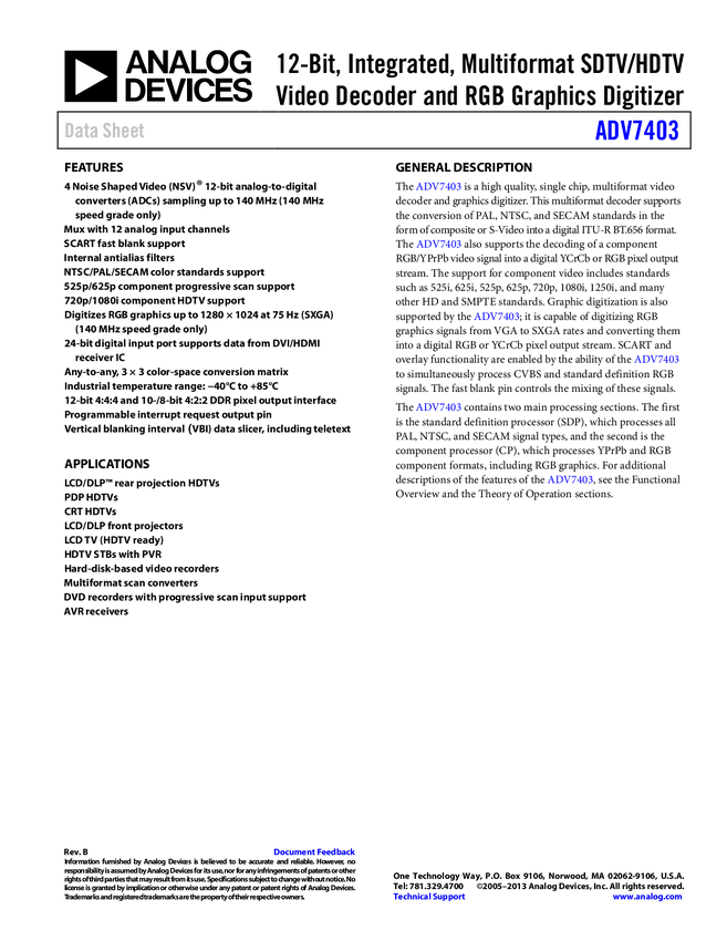 ADV7403: 12-Bit, Integrated, Multiformat SDTV/HDTV Video Decoder and RGB Graphics Digitizer