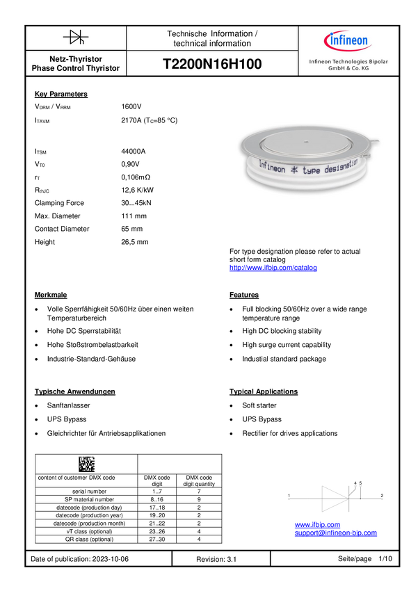 1600 V phase control thyristor disc Phase Control Thyristor 1600 V, 2200 A with 100 mm diameter and a height of 26 mm assembled in high reliable, robust and hermetic sealed ceramic housings. The T2200N thyristor disc is specially optimized for UPS-Bypass applications in terms of production effort and clamping force allowing same on state losses with smaller clamping systems. Our pressure contact chips in general provide best-in-class blocking stability and offers the highest current capability.