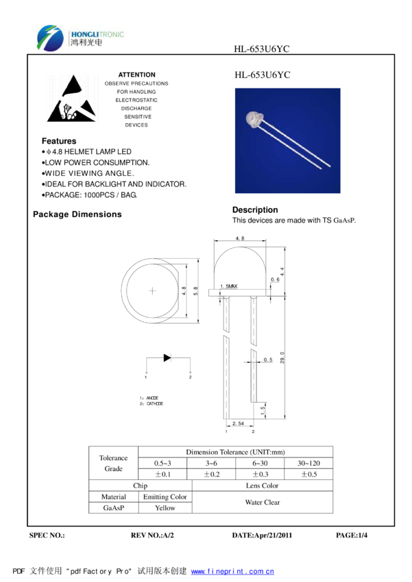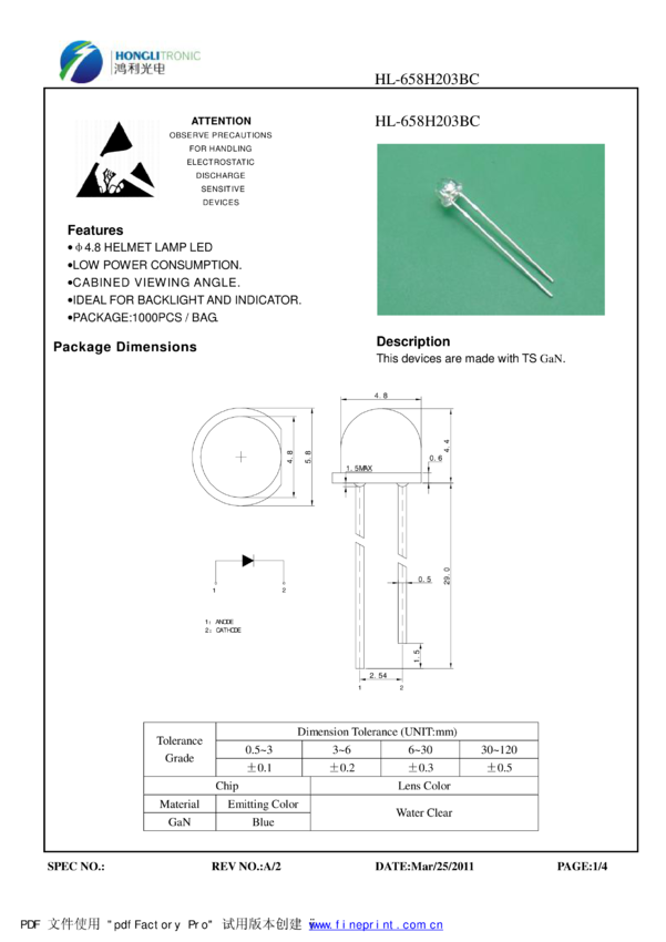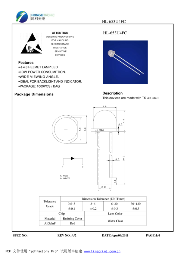 Dioda LED, 4.8mm, , 625 nm, superjasna 600-1320 mCd, water clear, 100 stopni, HELMET, Honglitronic