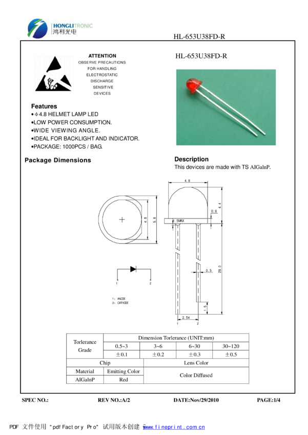Dioda LED, 4.8mm, , 625 nm, superjasna 460-1015 mCd, dyfuzyjna, 120 stopni, HELMET, Honglitronic