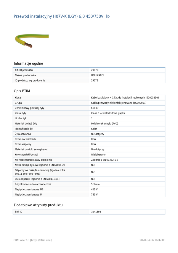Przewód; montażowy; H07V-K (LgY); 1 żyła; linka; Cu; 6mm2; żółto-zielony; PVC; -30...+80*C; 450/750V; zwój 100m; 5,3mm; 1x6mm2; 29178; HELUKABEL; RoHS