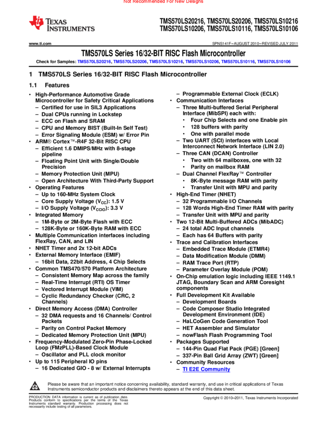 MCU 16-Bit/32-Bit Hercules TMS570 ARM Cortex R4F RISC 2048KB Flash 1.5V/3.3V 337-Pin NFBGA